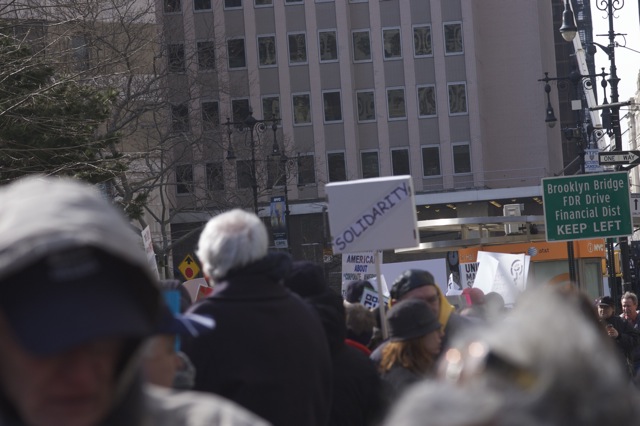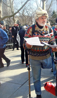 I met a one legged man handing out fliers. He was a jolly guy and said that there were a lot of people at the rally from the organization, MoveOn. There was a contingency from the New York Gray Panthers. Representatives from local unions stood in the crowd proudly displaying union patches on their jackets and waving placards. Nurses and teachers called attention to themselves with their signs.